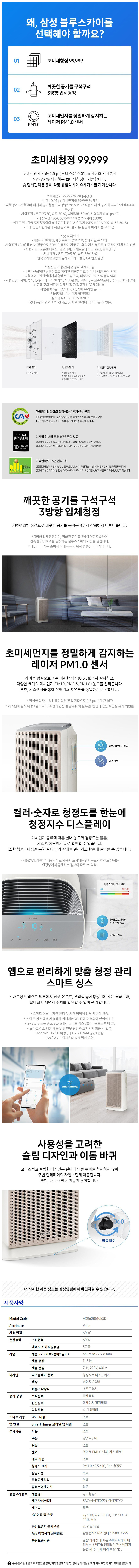 60㎡ x 항균필터 x 듀얼 청정 센서 x 레이저PM센서 x 필터 교체 알림